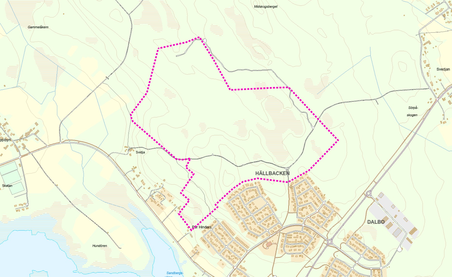 Skogen och myrområdet nordväst om Hällbacken innehåller varierade och intressanta naturtyper. Här finns hällmarker, blåbärsskog, lövträd och myrar som ger utrymme för ett rikt växt- och djurliv. Området är också ett besöksvänligt och viktigt rekreationsområde med trevliga utflyktsmål, promenadstigar och ridvägar.