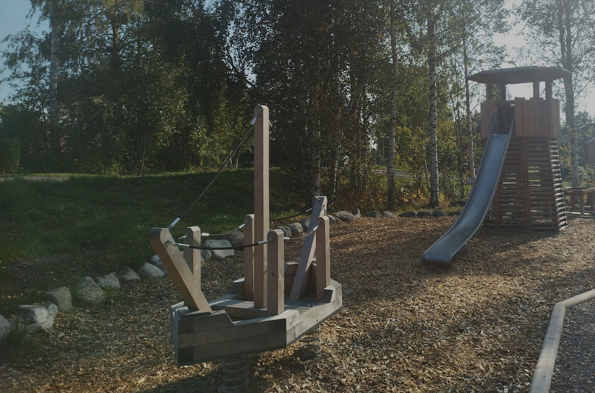 Utifrån en dialog med barnen i byn har vi satt ihop olika lekmiljöer med lektorn, bollplank, kompisgunga och mycket mer. Material och lekredskapen i lekplatsen är inspirerade av skärgården med stenar, sand, fyr, båt, ”bryggor”, trä, rep. Det finns också svartvinbärsbuskar och ett par nya träd.